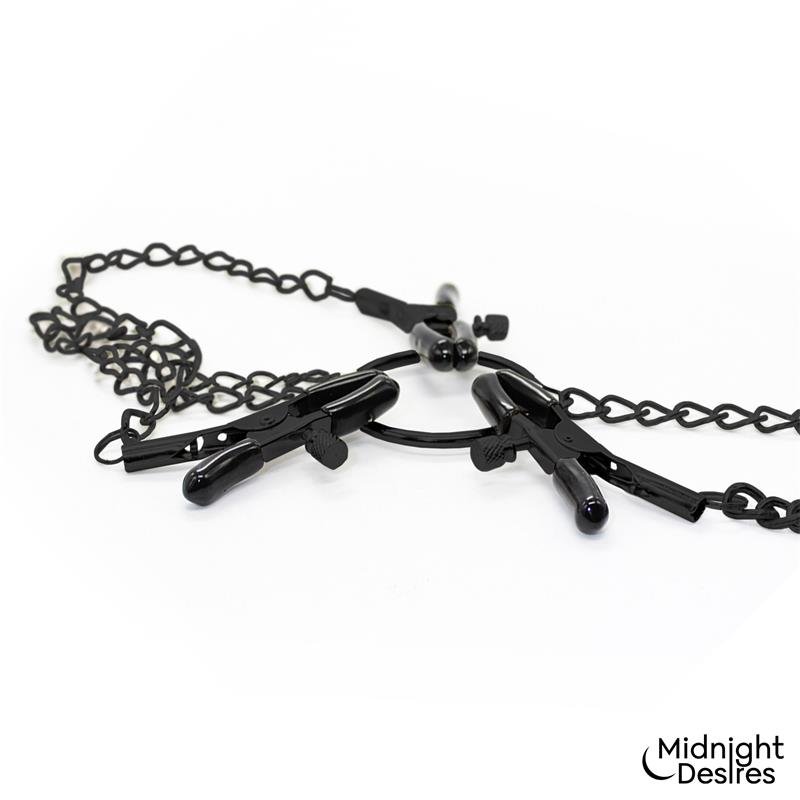 ¿Quieres experimentar el placer real? Prueba este set con pinzas para pezones y clítoris. Estas pinzas van unidas con una cadena, lo que es ideal para añadir un toque extra de diversión a vuestros encuentros, y las pinzas son clásicas y ajustables.