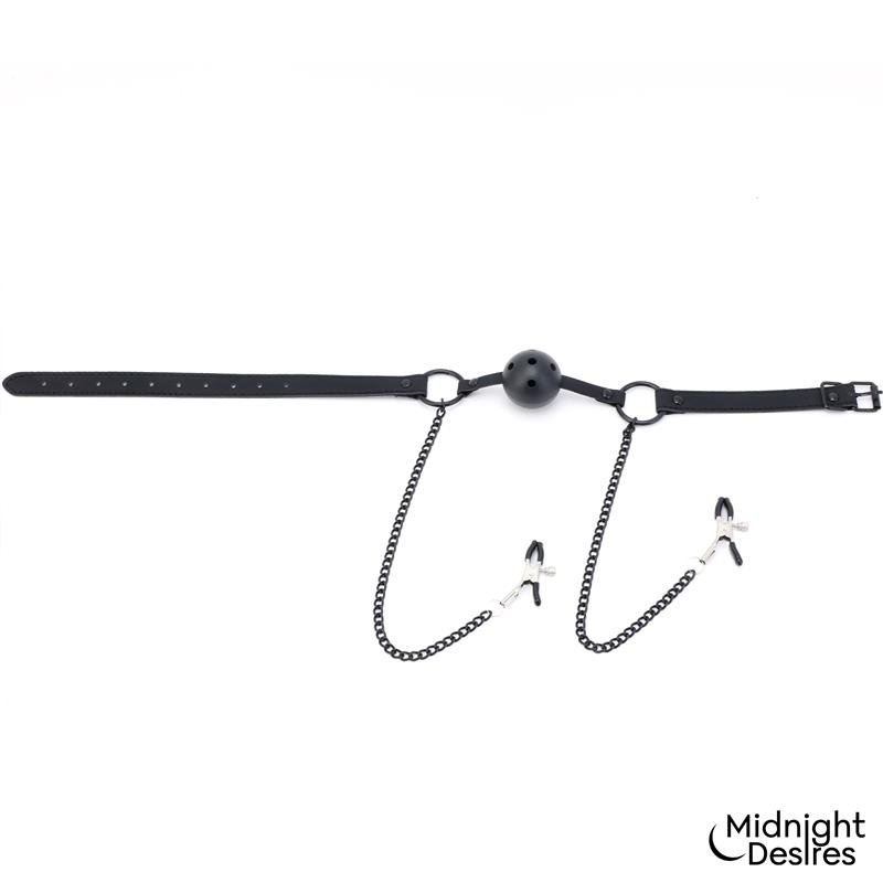 ¿Quieres disfrutar de una noche de BDSM real? Prueba este set con pinzas para pezones y mordaza de bola. La mordaza de bola es traspirable y las pinzas son clásicas y ajustables, ambas cosas unidas por una cadena en negro.