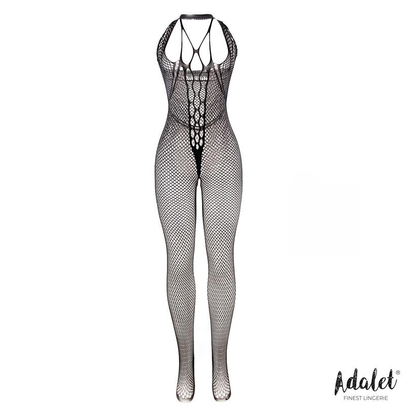 Julia es un Bodystocking con patrón de rejilla mixta. Cuenta un escote amplio lleno de tiras y llega hasta los pies.